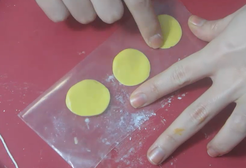 قومي بتطرية العجينة بعجنها قليلا و من ثم قطعي 4 قطع صغيرة و قومي بلفها على شكل كرات مع لف القطعة الرابعة على شكل مستطيل. ضعي قطعة المستطيل في داخل الكيس البلاستيكي المرشوش بالقليل من نشا الذرة لتجنب الإلتصاق، قومي بالضغط على الجزء الأمامي من اليمين إلى اليسار و العكس لتصبح المنطقة الأمامية رقيقة، كرري العماية مع باقي الكرات لتحصلي على التالي: